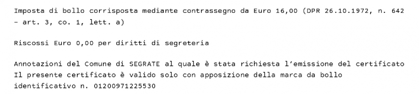 In tutti gli altri casi in cui è richiesta la marca da bollo il certificato riporta il codice identificativo della marca o numero seriale. La marca da bollo deve essere apposta sul certificato lo stesso giorno di emissione del certificato. La marca può essere acquistata dal cliente che riceverà quindi un certificato predisposto per l'apposizione del bollo, oppure acquistata dal nostro servizio completo di acquisto marca + apposizione marca + invio certificato.
