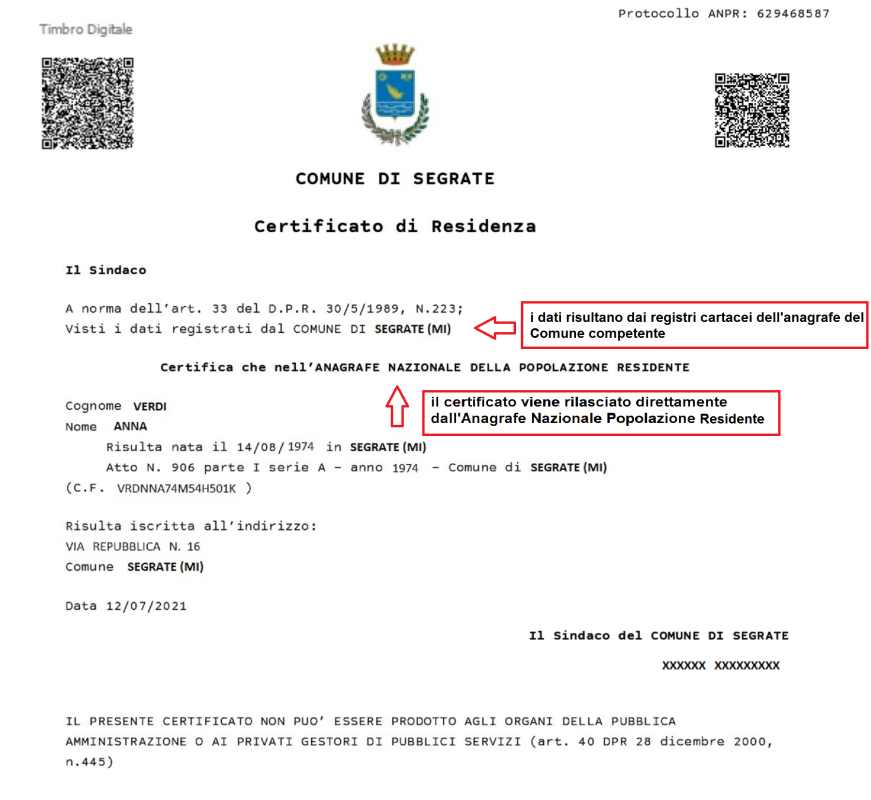 Il certificato anagrafico o di stato civile rilasciato da ANPR tramite il Comune competente è un certificato digitale, emesso online dal sistema informatico dell’Anagrafe Nazionale Popolazione Residente e reso valido dal codice QR indicante il numero di protocollo ANPR.