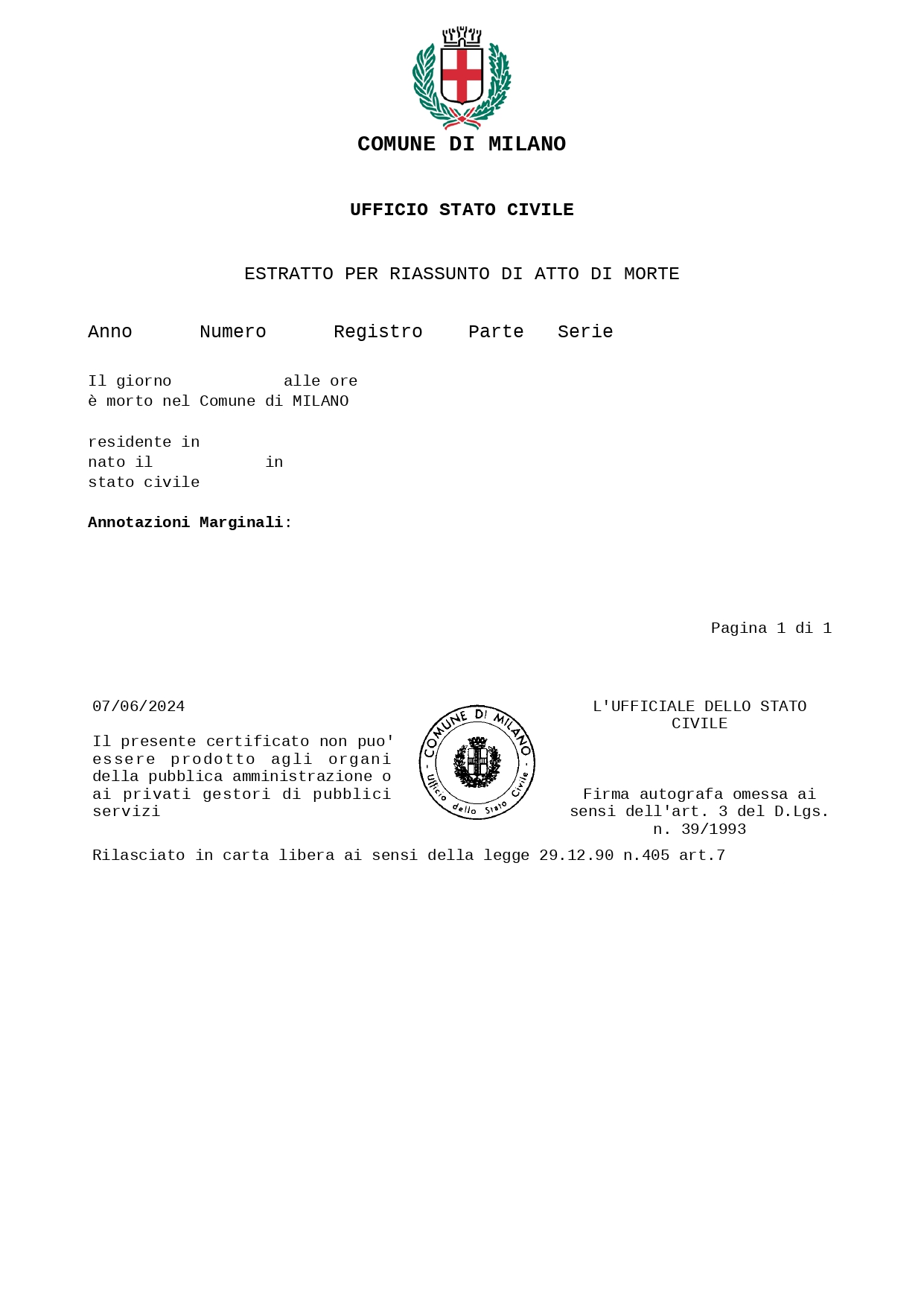 I certificati di Stato Civile (nascita, matrimonio, morte, unione civile, convivenza) sono SEMPRE esenti dal pagamento dell'imposta di bollo ex Art. 7 comma 5°, L. 405 1990